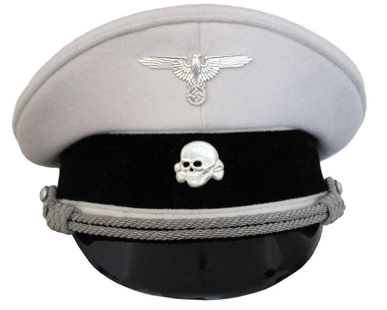 This visor cap replicates the style worn by officers of the Allgemeine SS—the administrative and non-combat division of the SS.